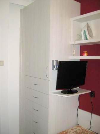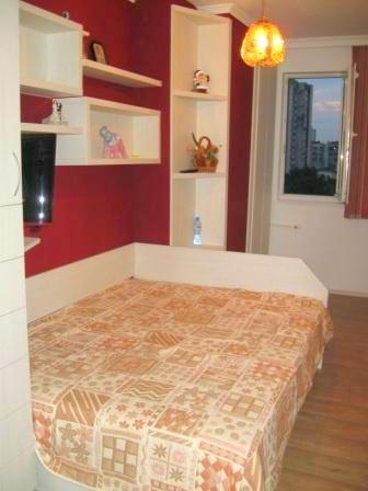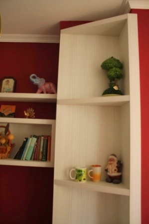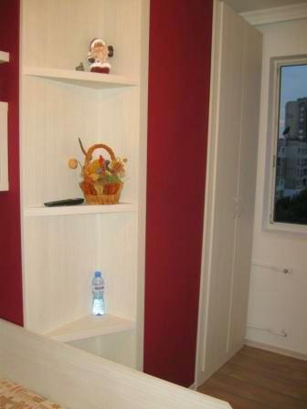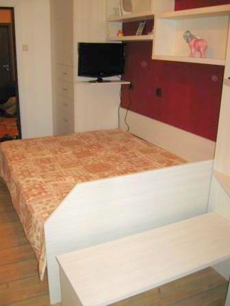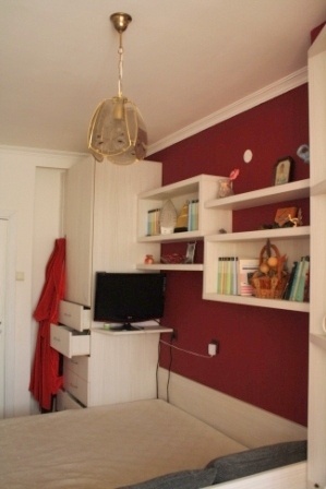 Комплекта е проектиран и изработен така, че да се оползотворо максимално пространството в стаята без да изглежда претрупано. Спалнята е съчетание на коралово червеното на стените и бледото пясъчно на обзавеждането придава леко провокативна нотка и дискретне елегантност. Стенните етажерки, както и ъловата етажерка зад спалнята допринасят за усещането че това не е просто стаята за спане а помещение със свой характер и потенциал. Гардеробите са два единия е вграден в дъното на стята до прозореца докато другия е в самото начало до вратата. Това решение предодвратява възможността гардероба да е прекалено голям и да обсеби стаята. Моделът може да бъде изработен по ваши размери в гогата цветова гама.