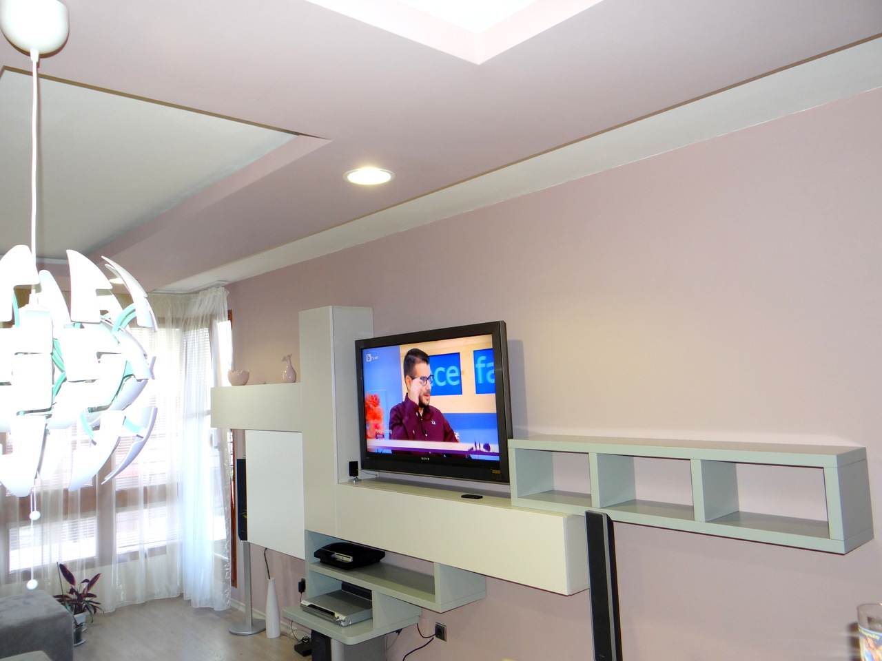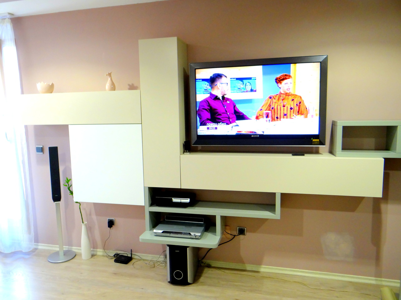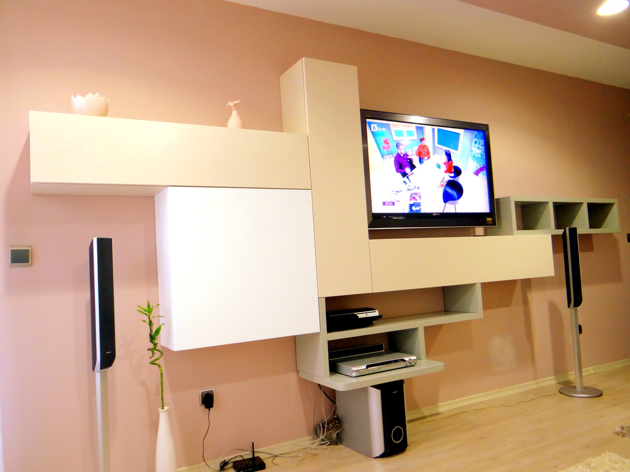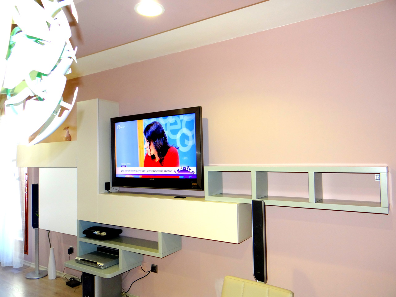 Шкафа е изработен от МДФ, боядисан в нежни цветове с матов завършек. Шкафа е изграден от различни геометрични модули умели съчетани според вкуса на домакинята. Много модернистичен и елегантен акцент в хола. Вратите се отварят с пуш системи и амортесьори. Моделът е изработен по индивидулен проект и може да бъде решен в богата цветова гама и размери на клиента.