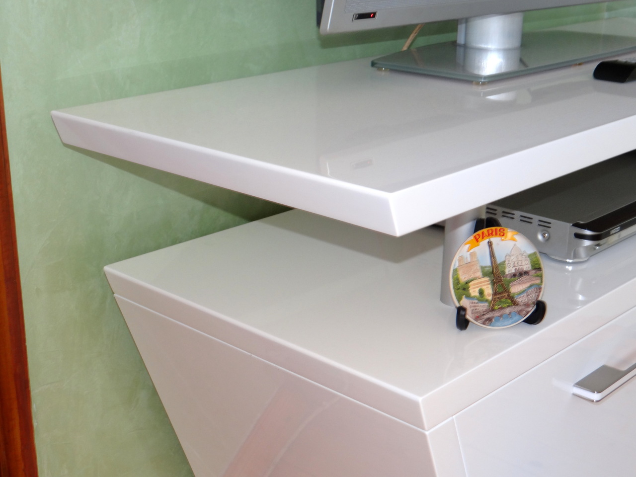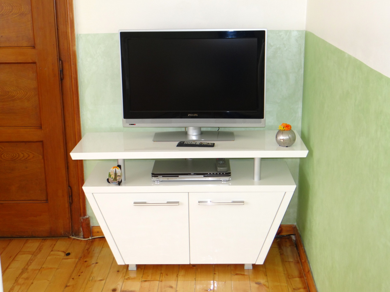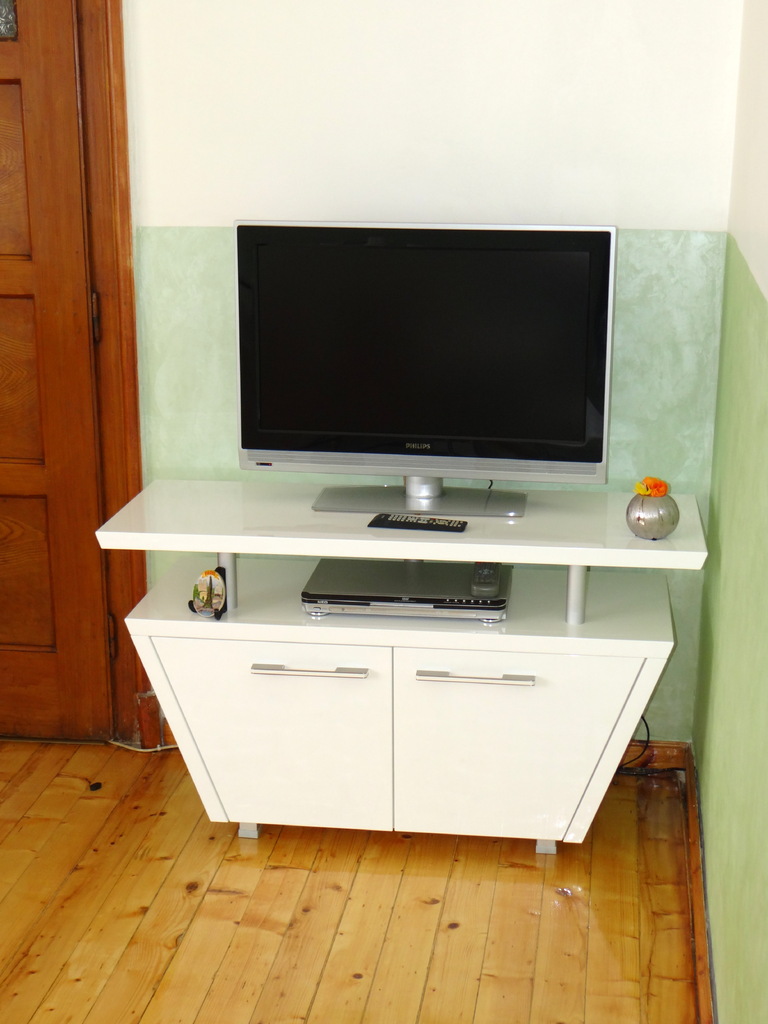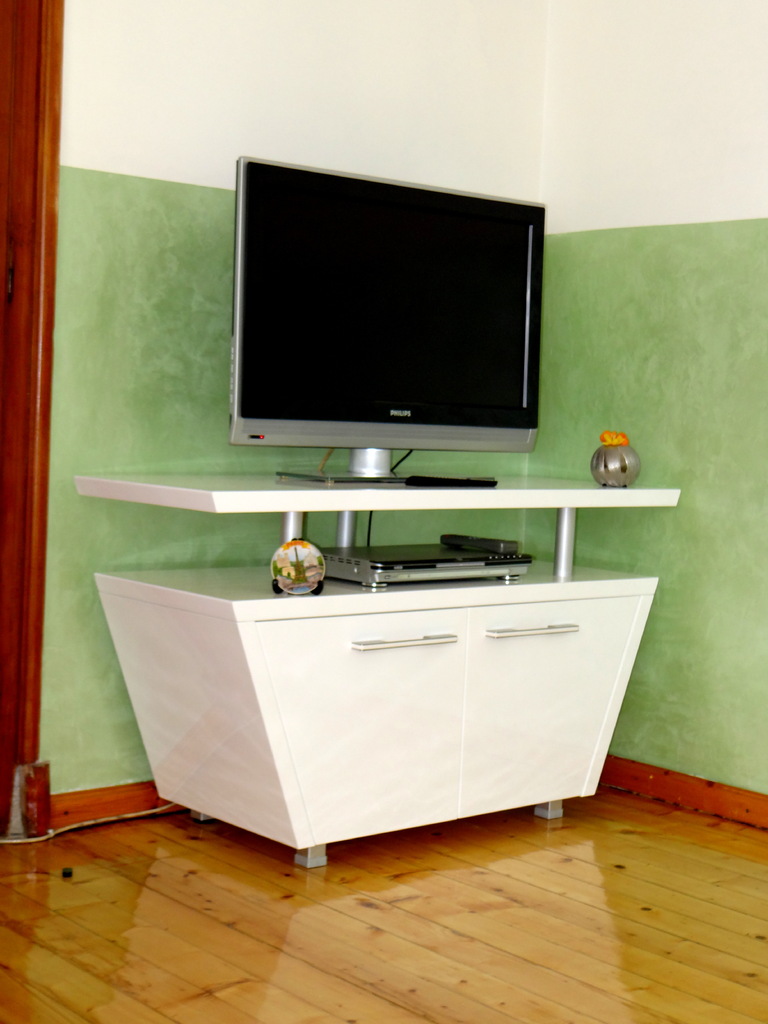 ТВ шкафа е изработен от ламинирано ПДЧ и МДФ бял гланц. Линията е изчистена и отговаряща на последните тенденции в интериорния дизайн, компактен, но функционален. Моделът се изработва в богата цветова гама и размери на клиента.